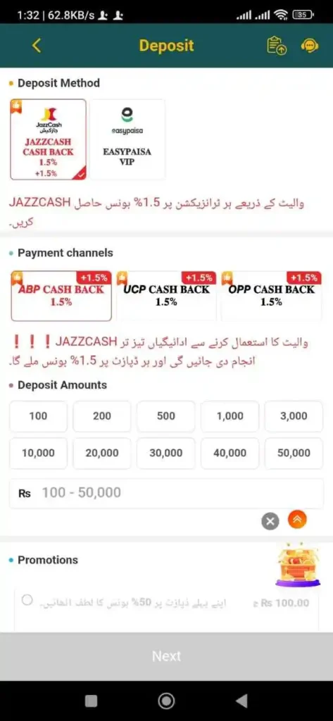 Depositing money is simple, and you can start playing with a small balance. Most users prefer EasyPaisa or JazzCash due to their convenience and fast processing times.